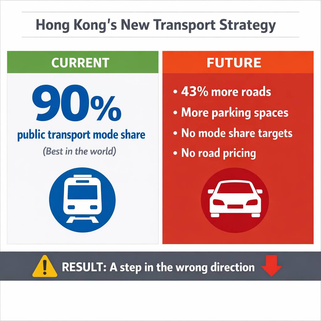 Unfortunately, this Hong Kong transport strategy has fallen into this trap. There is something for everyone - people walking, cycling and using public transport, but also car users, signalled by the increase in roads (40%+) and increased parking!