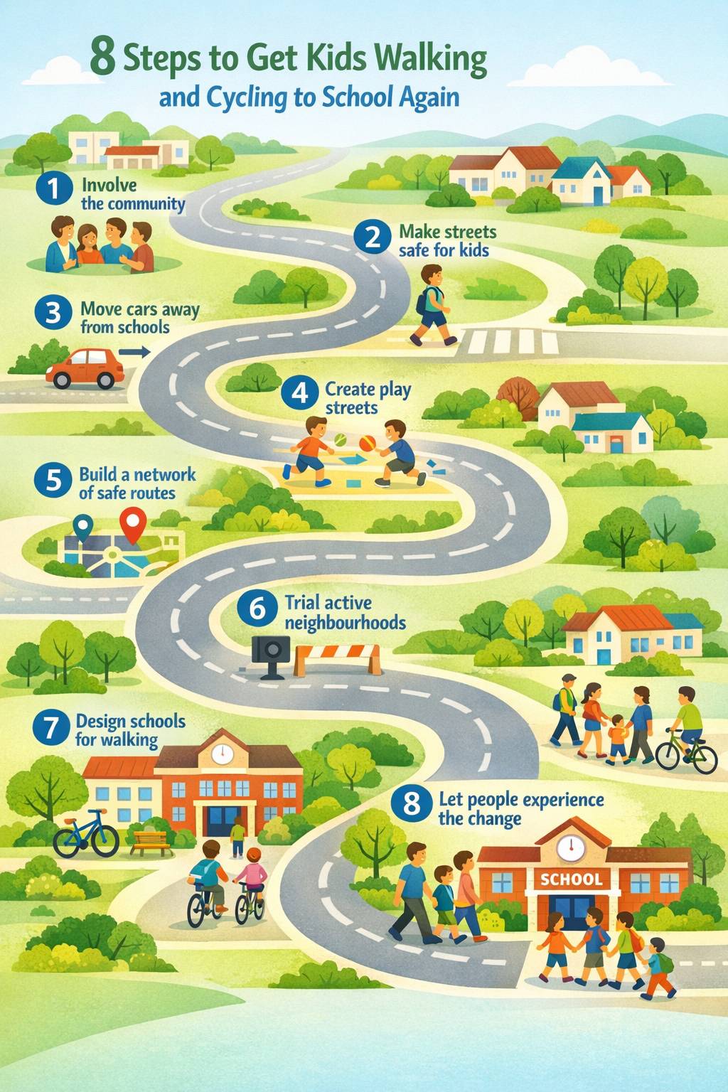 - Implement community-led, bottom-up changes to make local streets safe, comfortable, and healthy for kids - Implement targets and programs for active travel to school, safer speeds, and transformative projects that encourage kids to walk independently while discouraging car traffic.