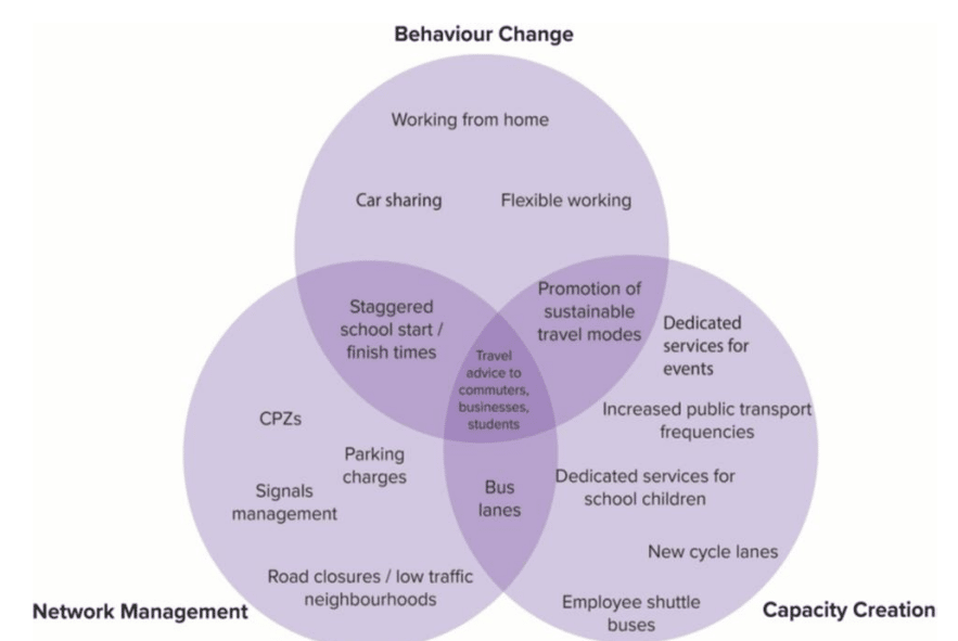 - The three pillars: behaviour change, capacity creation, and network management, can be leveraged to influence travel patterns leading to significant impacts.