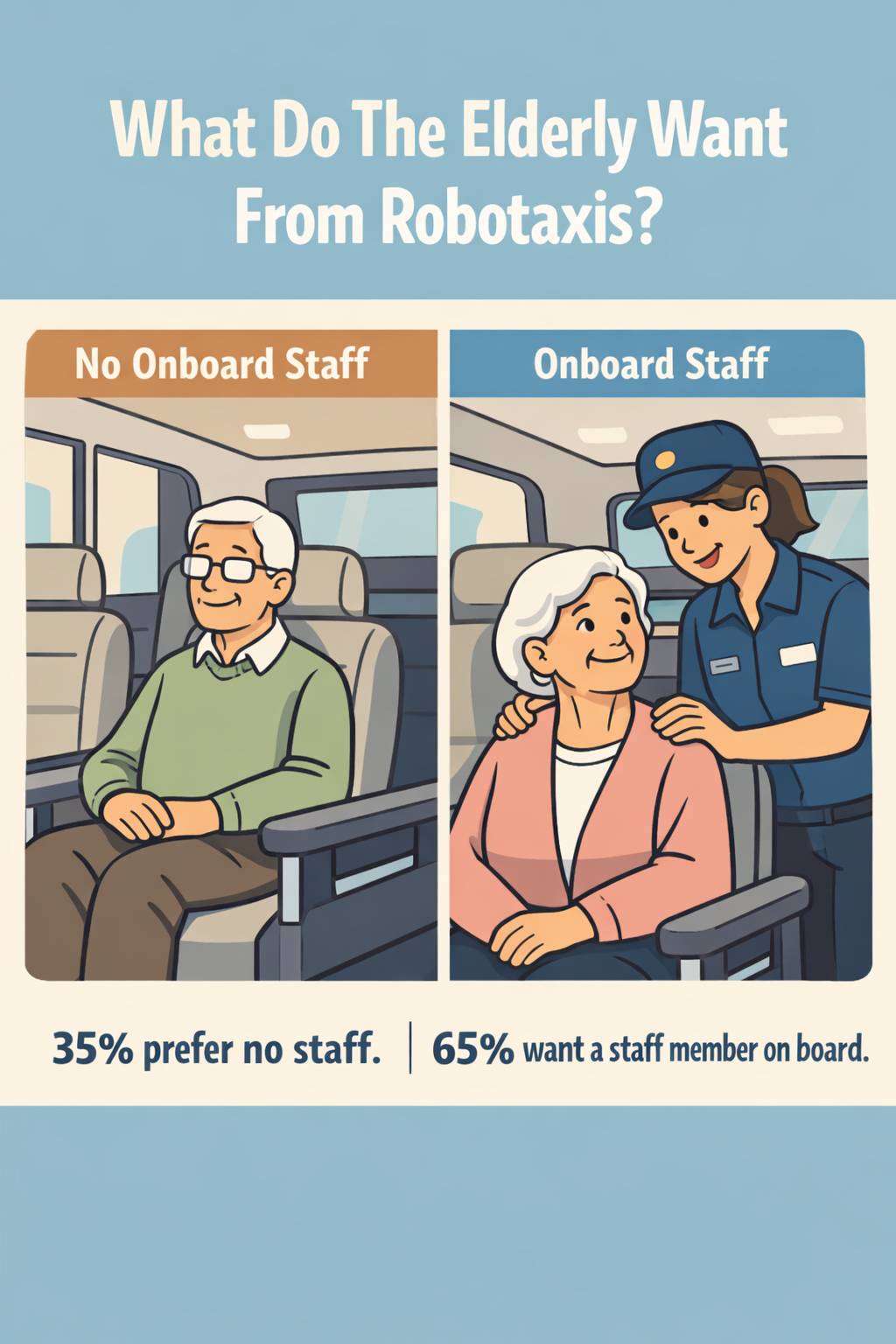 - The elderly had wide differences of opinion on the provision of on-board staff. About 35% of them hold a negative perception of this arrangement, while others were more likely to want an on-board staff member for safety concerns.