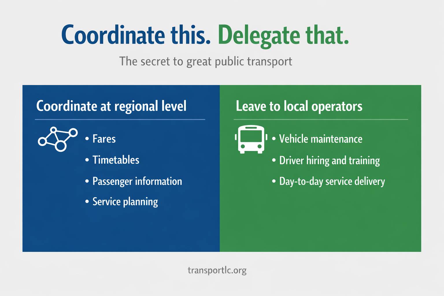 - Key features of these regional coordinators include clear mandates about responsibilities, transit-knowledgeable governing boards, and the power to coordinate fares, information, and planning across operators.